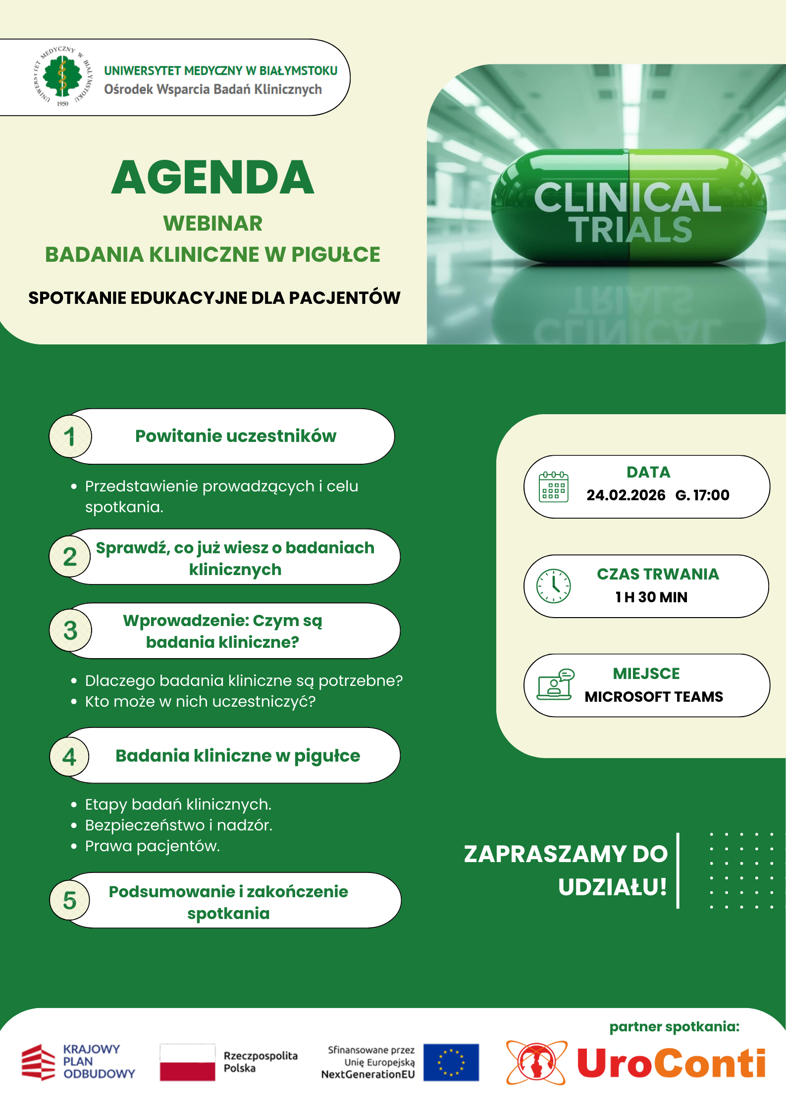 W imieniu Stowarzyszenia „UroConti” zapraszamy na webinar poświęcony badaniom klinicznym, organizowany we współpracy z Uniwersytetem Medycznym w Białymstoku. Spotkanie będzie okazją do zdobycia rzetelnej wiedzy na temat roli badań klinicznych we współczesnej medycynie oraz lepszego zrozumienia zasad udziału pacjentów w tego typu projektach.